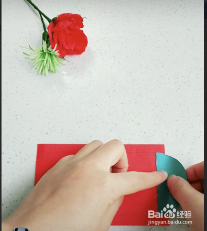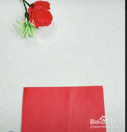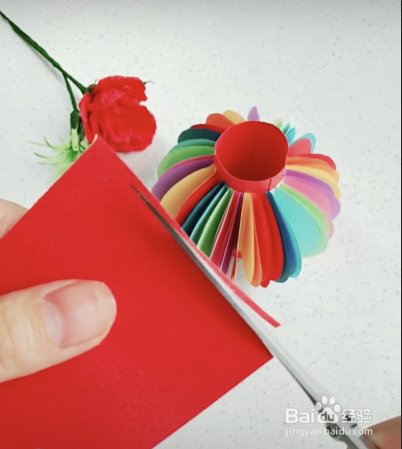 接下来做灯楼的须须,取一张红色折纸,用剪刀剪成一条条长条,注意均匀,这样会比较好看
