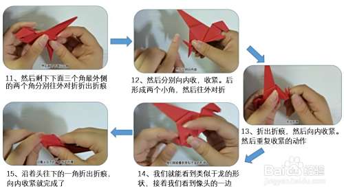 然后剩下下面三个角最外侧的两个角分别往外对折折出折痕,然后分别向内收,收紧。后形成两个小角,然后往外对折,折出折痕,然后向内收紧。然后重复收紧的动作,再折出一个更小的角,我们就能看到类似于龙的形状,接着我们看到像头的一边。沿着头往下的一角折出折痕,向内收紧就完成了。