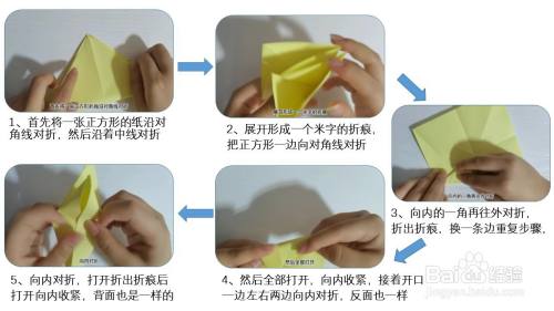 首先将一张正方形的纸沿对角线对折,然后沿着中线对折,展开形成一个米字的折痕,把正方形一边向对角线对折,向内的一角再往外对折,折出折痕,换一条边重复上面的步骤,只用对着两个角,然后全部打开,向内收紧,接着开口的一边左右两边向内对折,反面也是一样的,向内对折,打开折出折痕后打开向内收紧,背面也是一样的。
