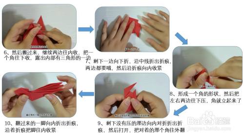 然后打开向内收紧,形成龙的尾巴,另外一个角也是向外打开然后向内收紧,这个步骤重复两次,形成龙的头,接着把剩下大的那个角向外对折,最后折出折痕后向内继续对折,另外一边也是一样的,就完成了。