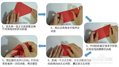 首先将一张正方形的纸沿对角线两边对折,折出折痕,然后再按照中线两边对折。形成一个米字形折痕,向内收紧,变成一个小正方形,开口的一边沿对角线向内对折,然后打开,另一边向中线对折,然后全部打开中间。形成一个小正方形的折痕,沿着小正方形的折痕向内收紧,形成一个钻石的形状,下面是收紧的开口, 两边沿着钻石形状两边的角向中线对折。