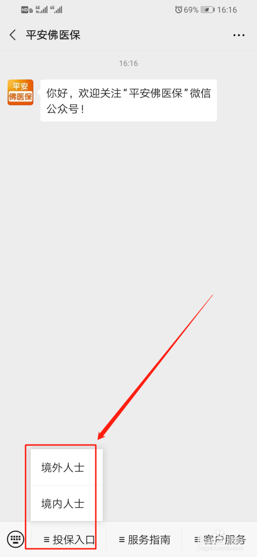 点击公众号左下角的【投保入口】,根据自身情况选择【境外人士】或者【境内人士】。