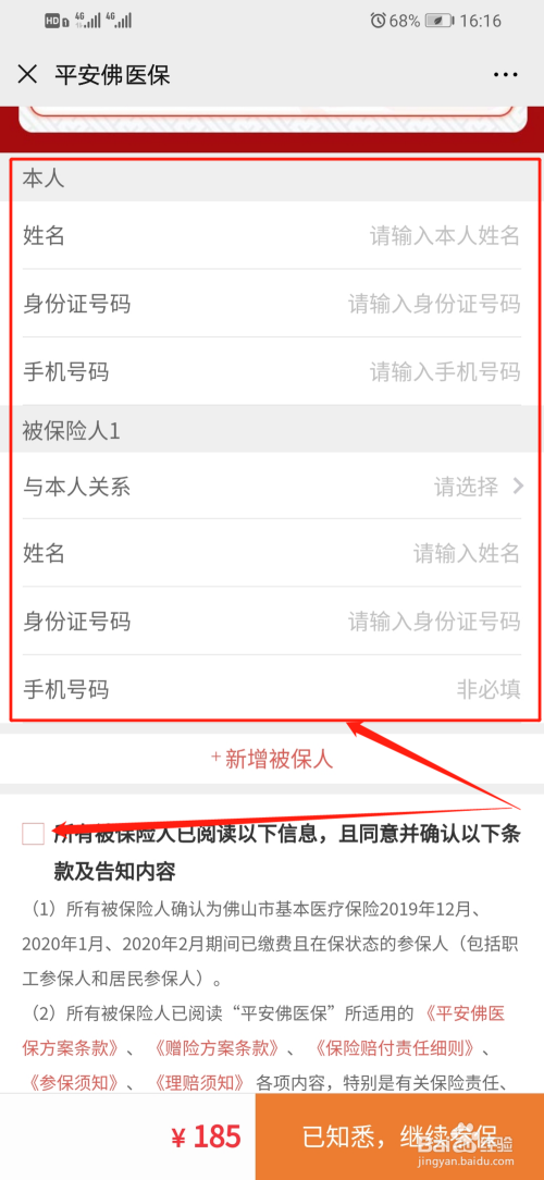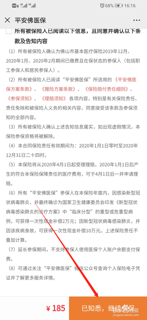 点击右下角的【已知悉,继续参保】,按照提示进行支付保费、上传证件等操作,完成参保。