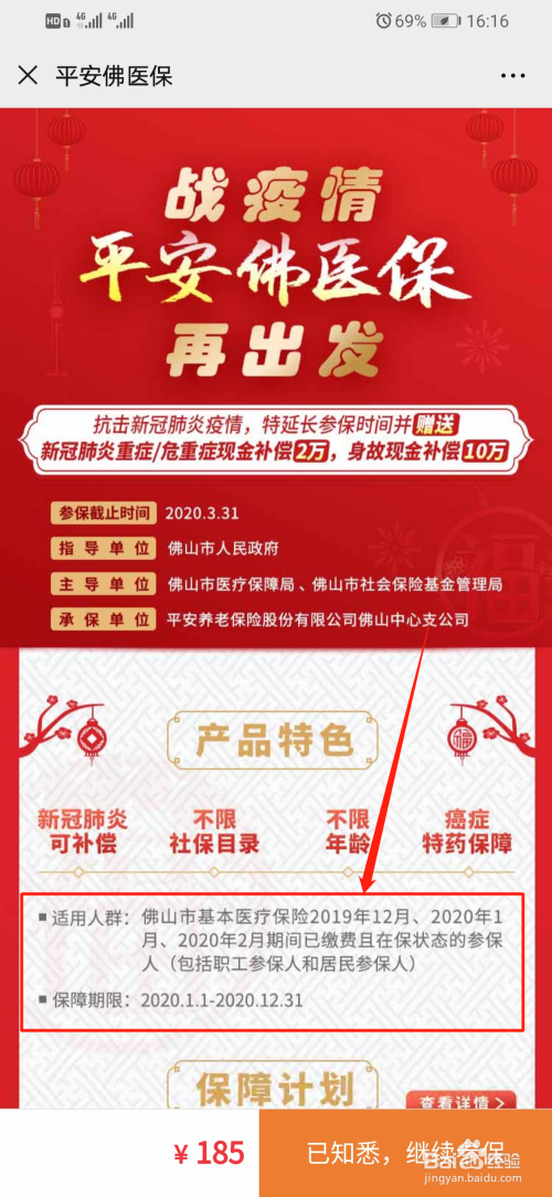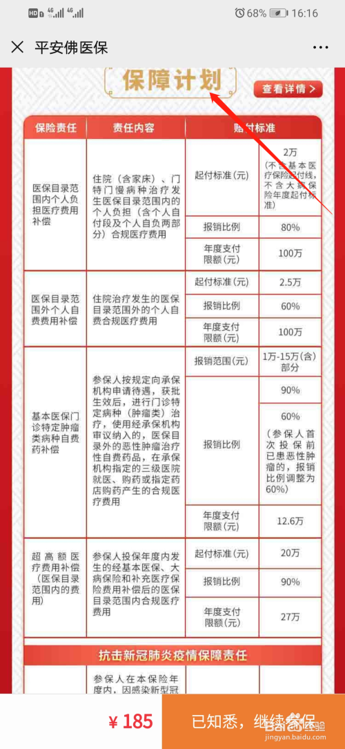 仔细阅读参保页面,了解适用人群、保障期限、保障计划等事项。