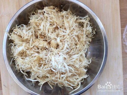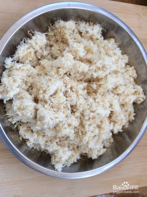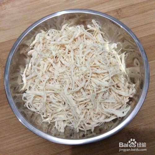 将鸡胸脯肉撕成鸡丝。这个环节比较耗时,大约得半个小时。在时间允许的情况下可以尽量撕得细一些。