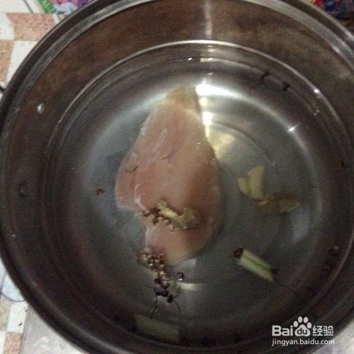 将鸡胸脯肉放入盛水的锅中煮30分钟,并加入生姜、花椒等调料。