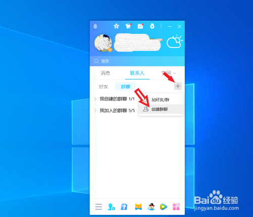 切换界面后,在右侧有一个【+】号,点击它打开列表选择【创建群聊】;