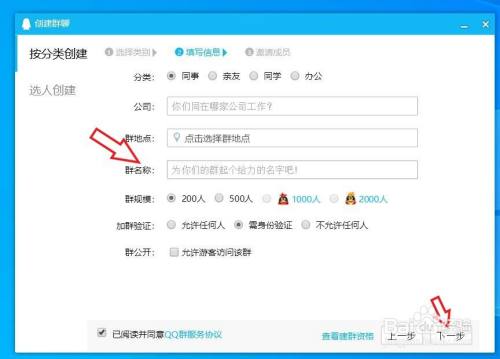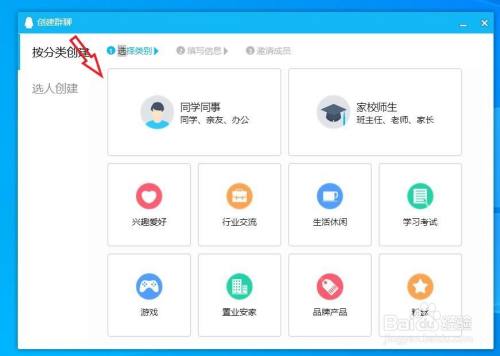 这时候弹出一个【创建群聊】的窗口,选择类别后填写这个群的名称,点击【下一步】;