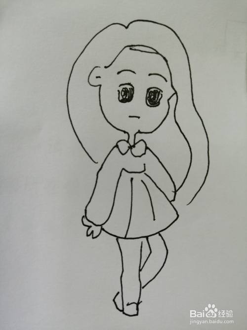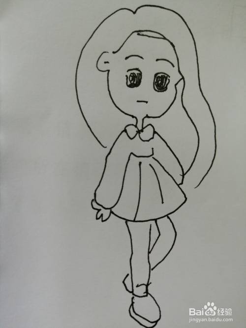 第七步,最后把长发小女孩脚上的鞋子画出来,后面的一只鞋子被挡住了。长发小女孩就画好了。