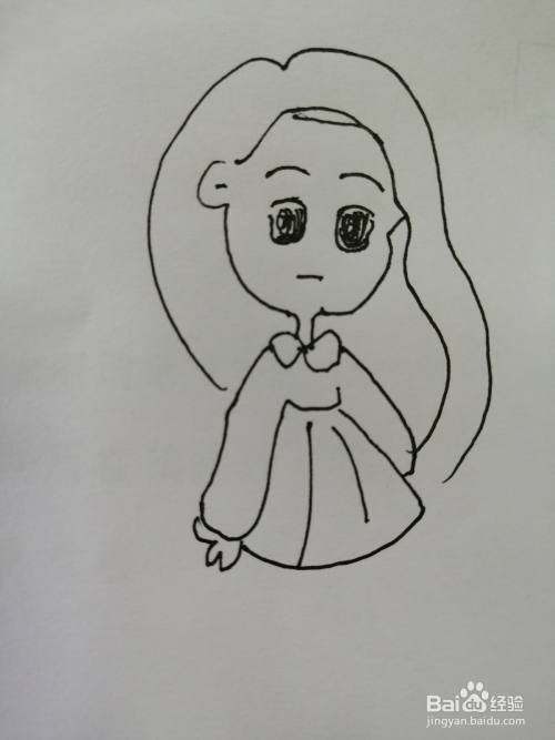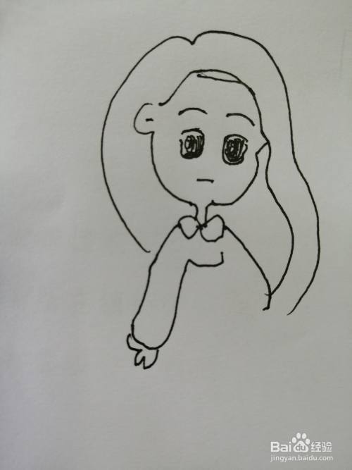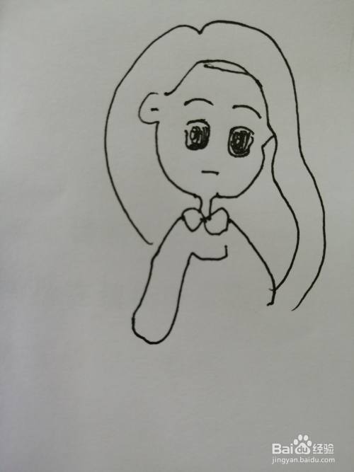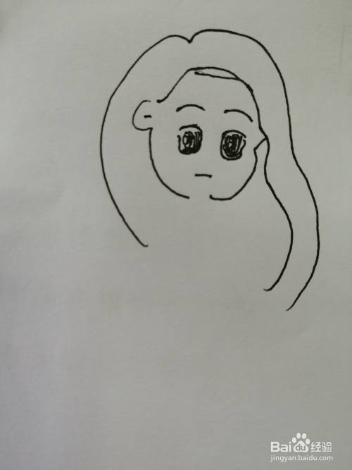 第二步,接着在长发小女孩的小脸上画出两只黑色的大眼睛,小女孩的眼睛很漂亮。