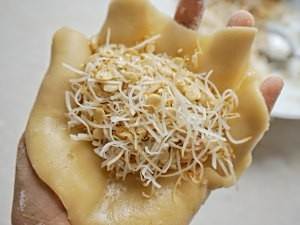加入30g馅料。我这次的馅料没有加水,比较干比较散,建议加水。
