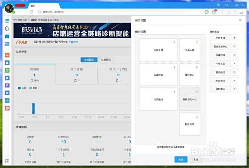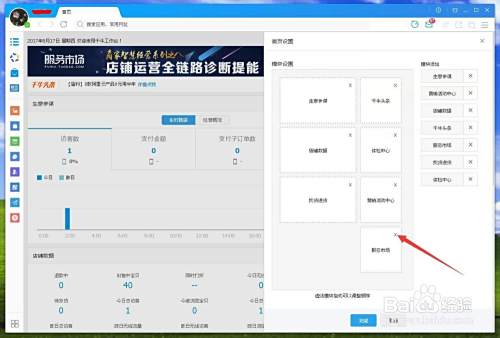 第三,如果觉得该模块不需要展示在千牛界面上,可对着模块右上方的小叉叉点击一下,即可关闭该模块。如关闭“服务市场”,关闭后,最右侧模块添加里的“服务市场”的叉叉变成了加号,点击加该加号,又可以重新添加到界面上。