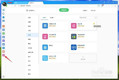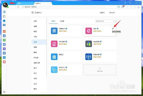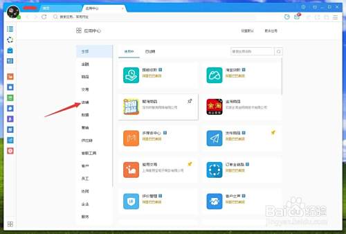 第五,点击“应用中心“,出现各项应用工具软件,可选择要展示在左侧的工具软件。如图,点击”店铺“,再点击”神笔“右上角的如钉子状按钮,神笔就添加到左侧工具条上。