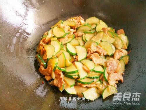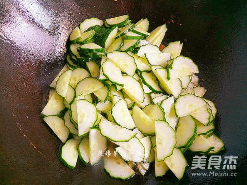 肉炒入味后,加入黄瓜。
