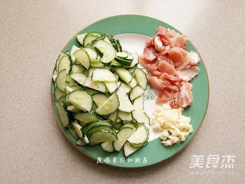 黄瓜洗净切半圆片,瘦肉切片,蒜瓣去皮切碎。