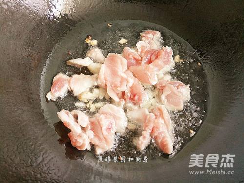 锅中倒入油烧七成热,加入蒜爆香,然后加入肉丝。