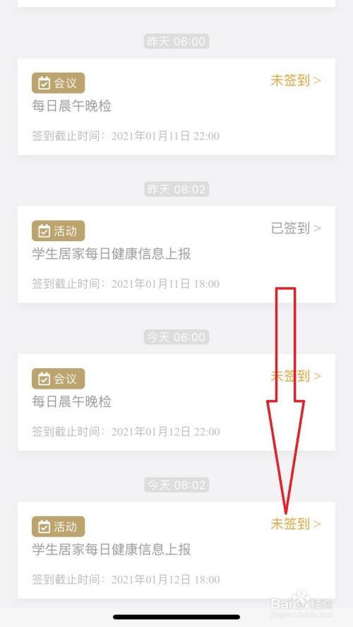在辅导员通知页面我们可以看到很多签到消息,我们点击需要签到的消息并点击“未签到”,进入签到页面。