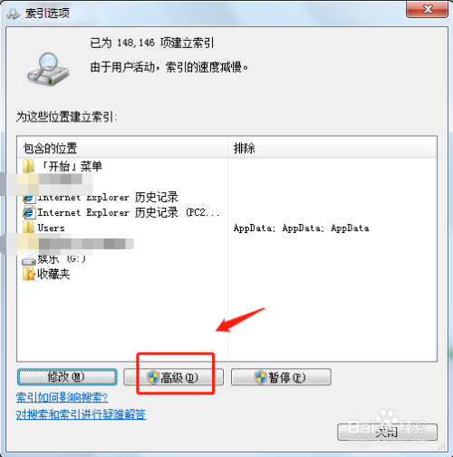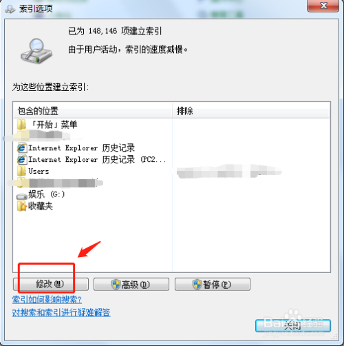 3.在索引选项中点击”修改“,修改系统的索引设置。