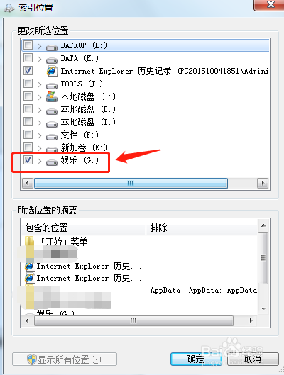 4.在索引位置中,在需要快速搜索的磁盘前面打钩,即可快速搜索此磁盘。