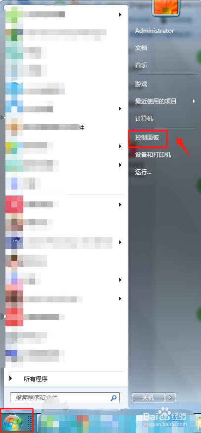 1.首先打开电脑,点击左下角的开始菜单,点击控制面板。