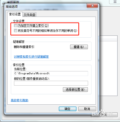 6.在高级设置中,将索引设置里”为加密文件建立索引“,”将发音符号不同的相似单词当做不同的单词“,前面的勾都取消掉,点击确定即可。