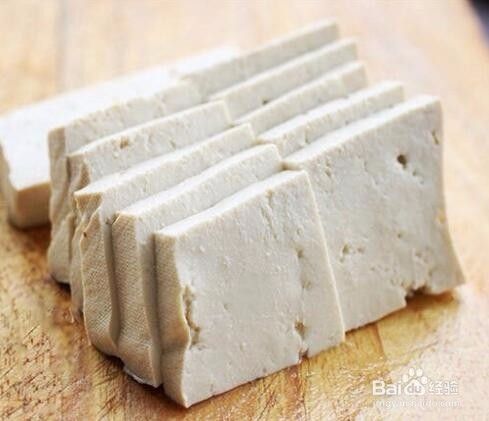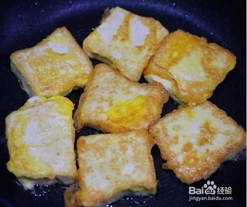 锅里加入油,油热后,将沾满鸡蛋液的豆腐片放入,小火剪至金黄色。