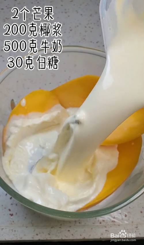 在搅拌机中加入2个芒果、200g椰浆、500g牛奶、30g白糖;