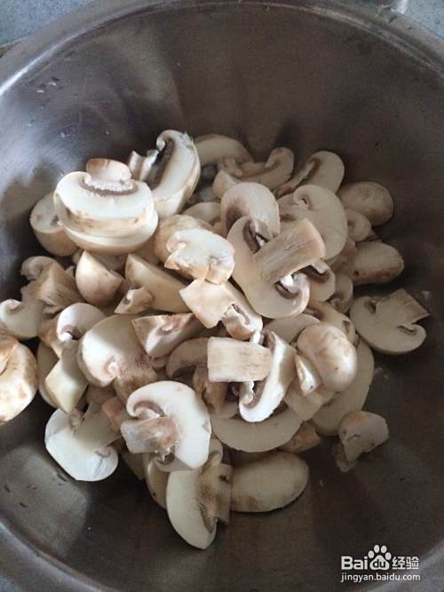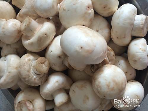 草菇清洗干净,这个过程耗时比较长,洗完以后晾凉水分,草菇根部可以用剪刀剪掉一部分。