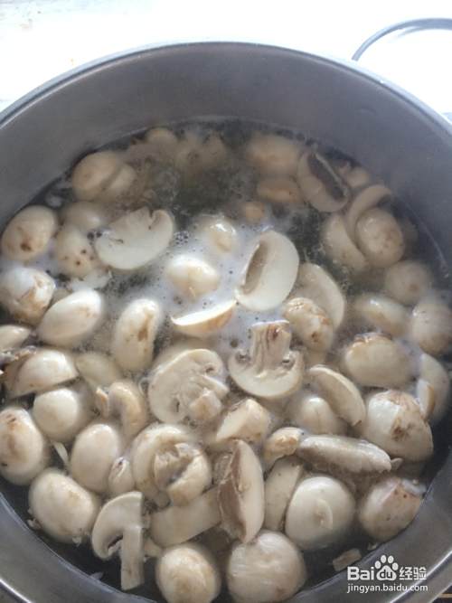 煮草菇,水适量烧开以后放入草菇煮6分钟左右,如果切的块大的话可以适当多煮一会儿。煮草菇的水取一点放到碗里留在拌馅时候用煮过以后捞出过凉水放置一会儿备用