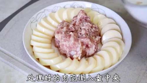 8处理好的肉馅倒入盘中央。