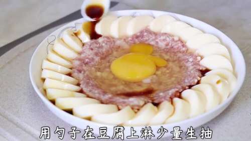 10敲入1个鸡蛋,用勺子在豆腐上淋少量生抽。