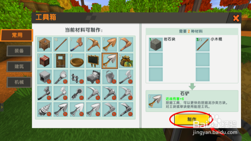 然后在用镐子收集1个岩石块,消耗小小木棍x3,岩石块x1制作铁铲。