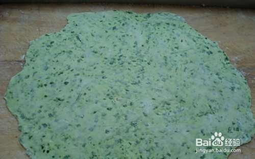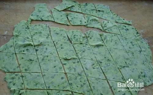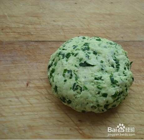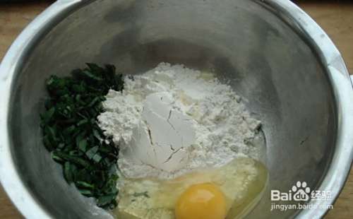 把面粉放入韭菜蛋液中,和面,尽量不要加水,如果水分真的不够用,可以酌量使用清水,把面和成合适的软度,不要太硬,太硬的话,擀面的时候不好擀,面坯易烂。