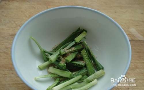 韭菜茎用五香粉,盐,香油,味精腌制。