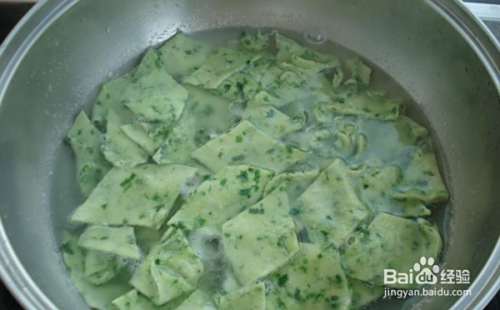 水开后下锅煮熟,煮熟的韭菜面片连汤盛入碗中,倒入腌好的韭菜段,搅匀即可