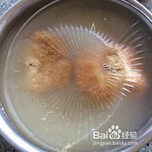 2个小时后,把猴头菇捞出来挤干水,再水龙头底下冲,多挤几次,直到挤出来的水分没开始那么黄。