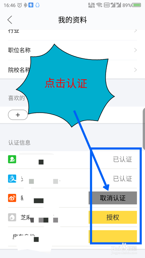 最下面的是认证信息资料,点击后面的就可以认证了。如图所示