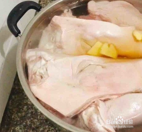 猪头清洗干净,浸泡两小时后放进锅里,加姜片和料酒煮开,去浮沫捞出再次清洗干净。