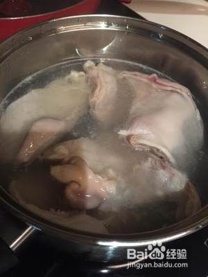 猪肚买回来,用盐、面粉,醋多搓揉,洗干净,然后用热水川烫过,鸡腿切块川烫备用