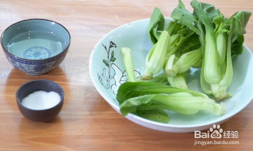 准备好食材,选择新鲜的小青菜,一定要选择新鲜安全的青菜,准备一点食盐和清水。