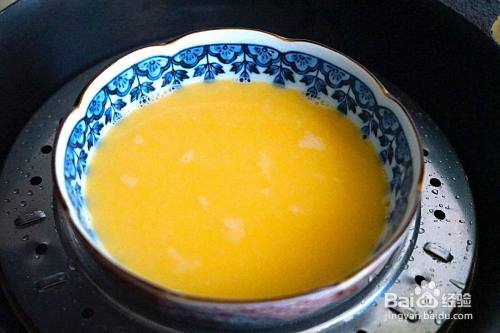 锅中加入2碗凉水,再将搅拌好的鸡蛋液倒入一个大碗中,开大火蒸7-8分钟左右。