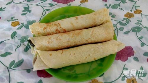 一饼二吃:可干吃,可卷菜。因家中没有可卷青菜,就用了自制香肠和腌黄瓜,味道也是非常好的。
