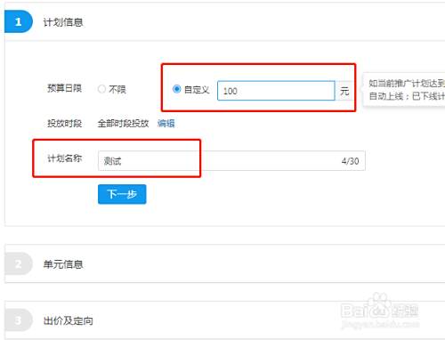 这里预算日限建议,设置100元为一天。如果你特别宽裕可以适当增加。名称大家根据自己的产品来取名,我这里仅为演示操作。