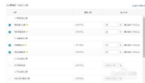 设置好了出价,下面就要来设置人群溢价了。因为第一次大家都不知道这其中是什么意思,建议可以尝试勾选几个测试一下点击转化效果。设置好了点击下一步。