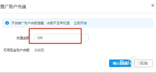 点击进入,进入充值窗口,这里金额最低是100元起。大家根据自己情况来决定充值金额。最后点击确定即可。
