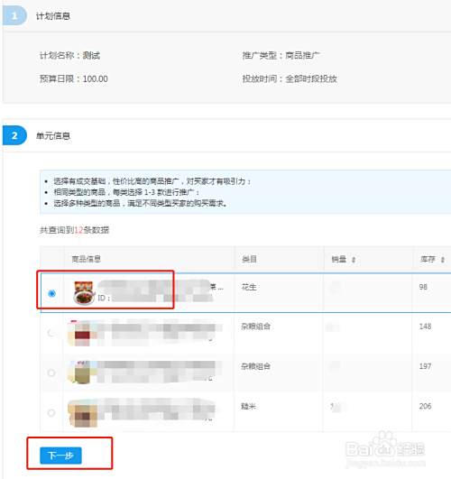 点击下一步,选择要推广的产品,确定好直接下一步、