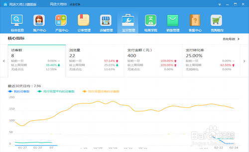 电商雷达功能:它可以记录并分析店铺流量、宝贝排名、买家来路、搜索关键词等数据,便于更科学的优化店铺、完善运营。