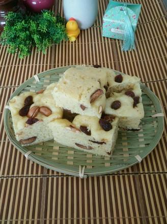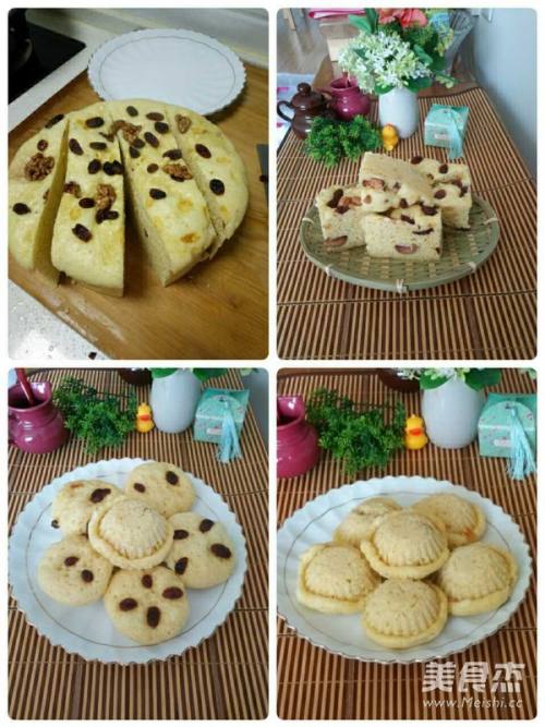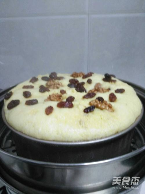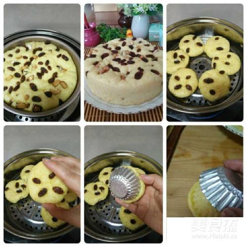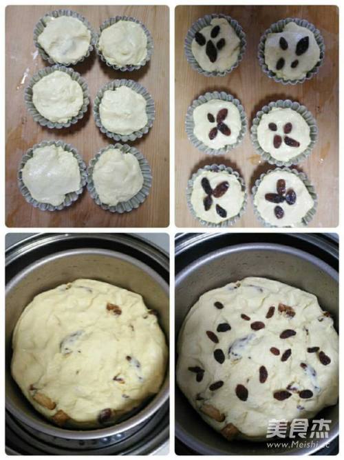 6将揉好的面里放入大枣肉揉均,再分别将面放入刷好油的模具里醒发40分钟。上面铺上葡萄干果仁。我用的是8寸蛋糕模具和马芬蛋糕模具。如果没有模具可直接在盆里醒发40分钟,将醒发好的面倒入笼屉布上然后用手蘸水拍平即可。