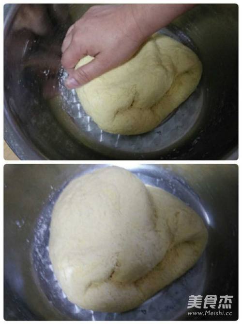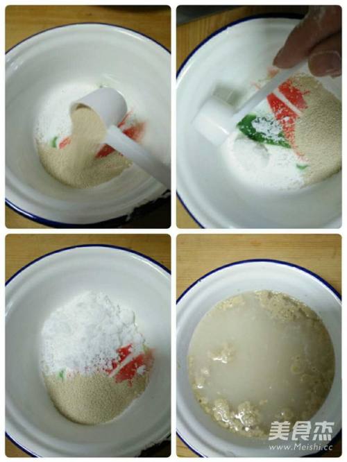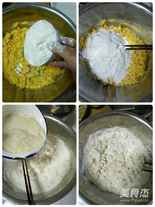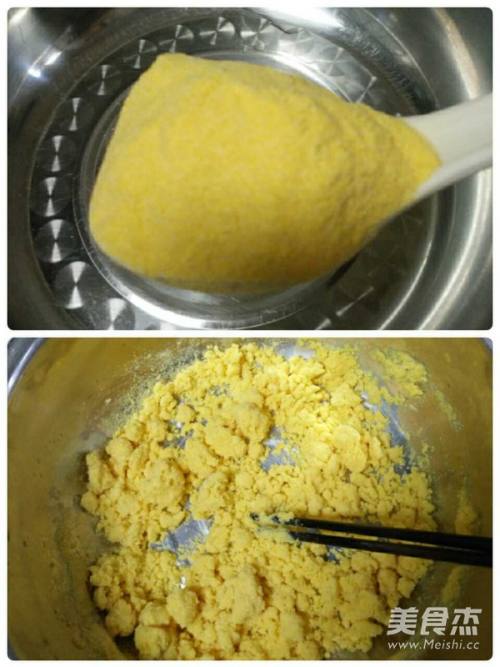 4将白面倒入晾凉的玉米面上,倒入酵母水搅成絮状