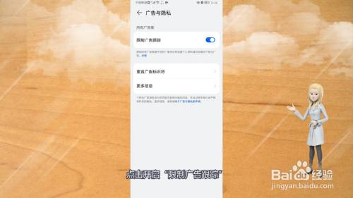 在广告与隐私界面中,点击开启“限制广告跟踪”,这样华为手机就不会弹出垃圾广告了。